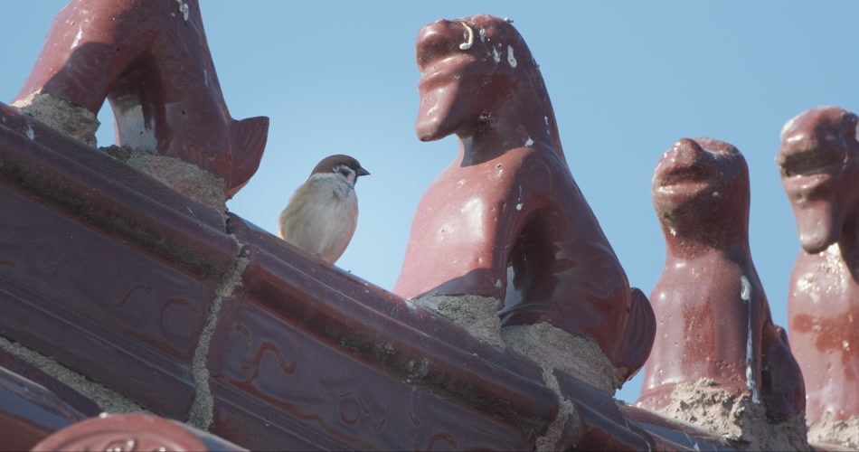 秋天寺庙屋顶麻雀起飞升格