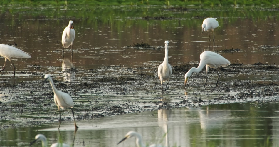 初春天一群白鹭在田野里觅食