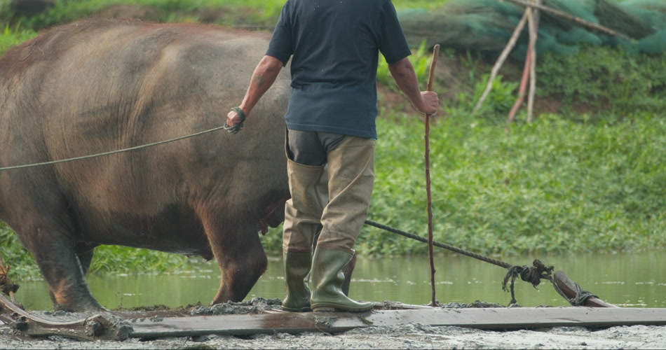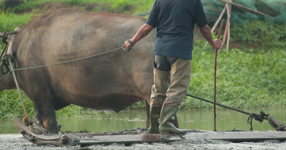 中国农村亚洲水牛犁田耕地