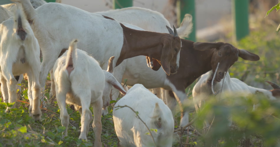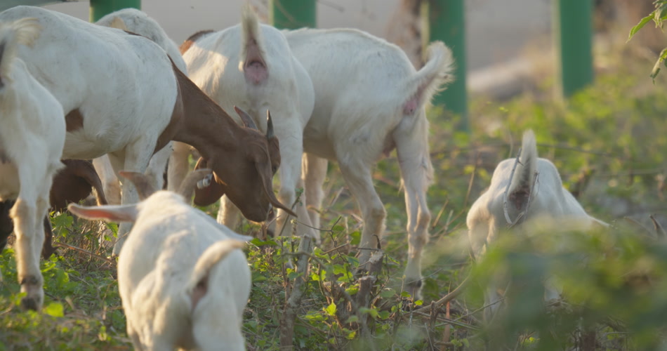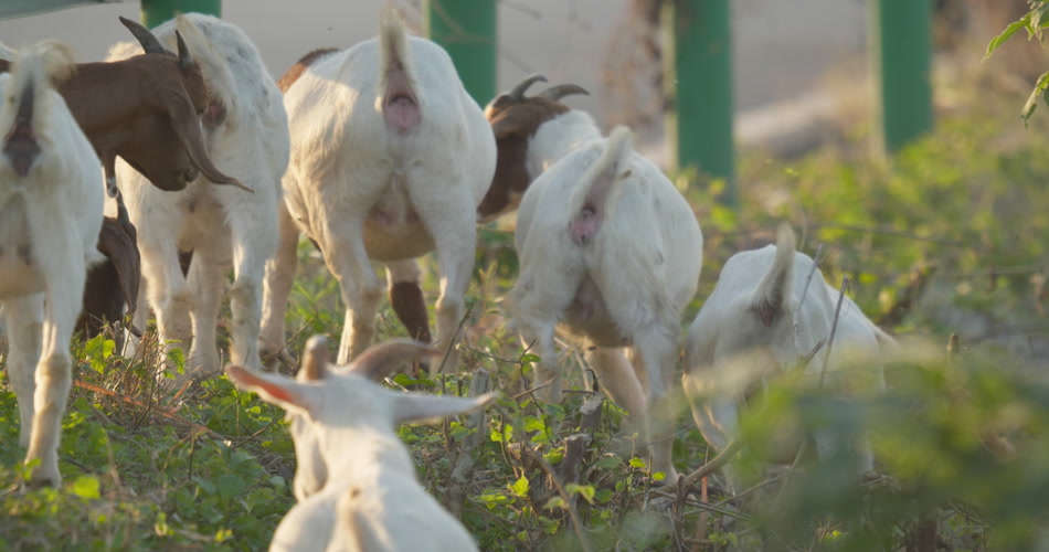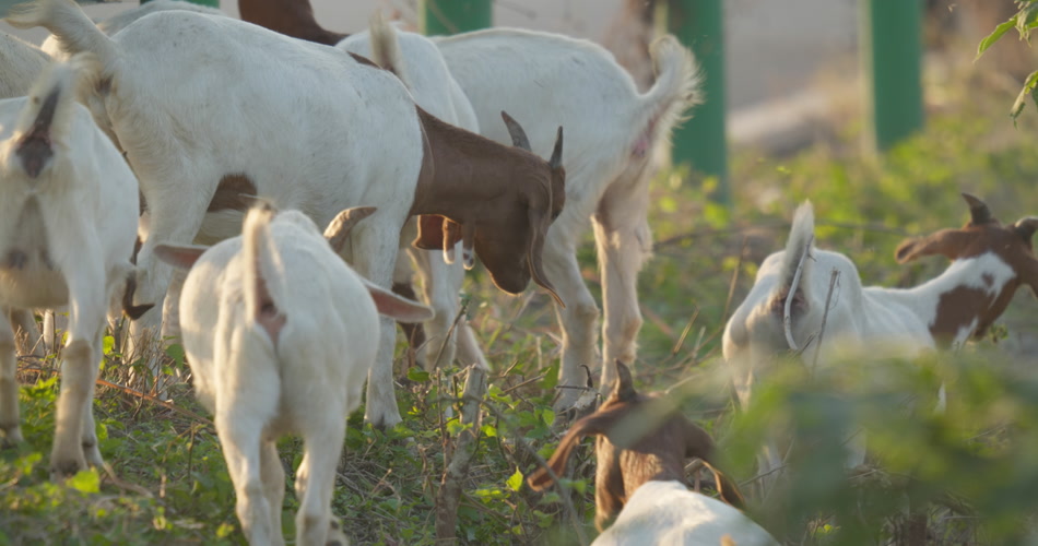 夏天清晨一群山羊草丛觅食