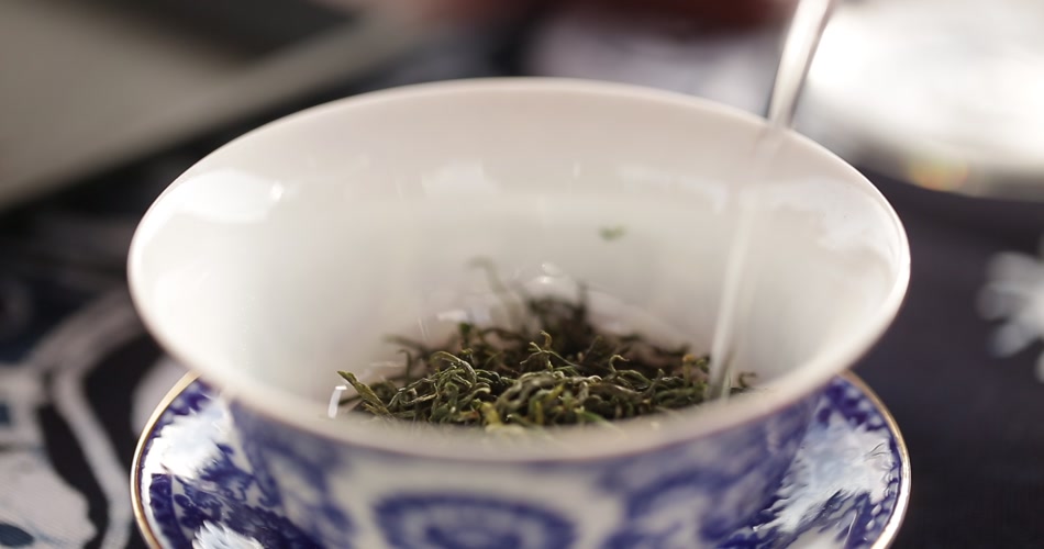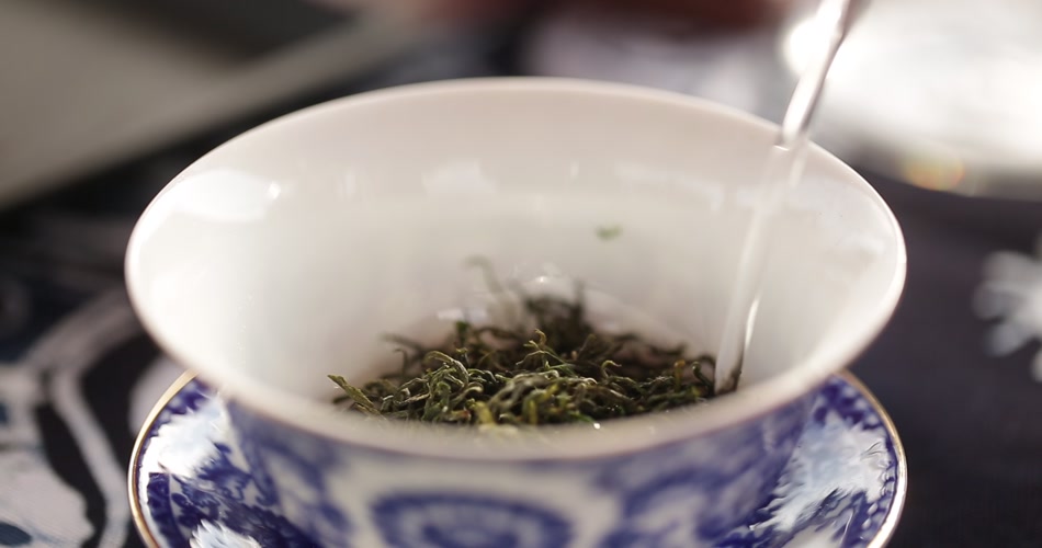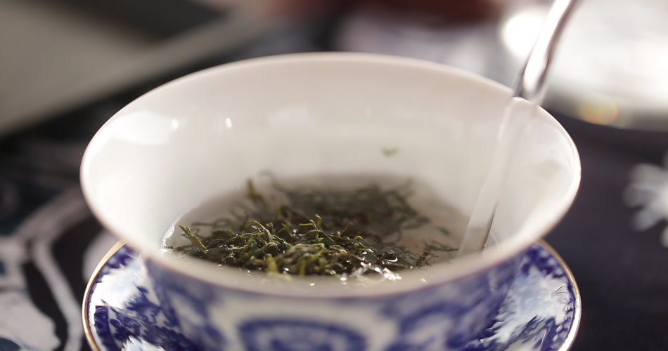 [泡茶]向茶杯中倒入开水露出部分茶叶实拍视频