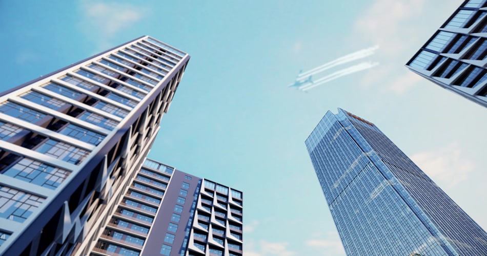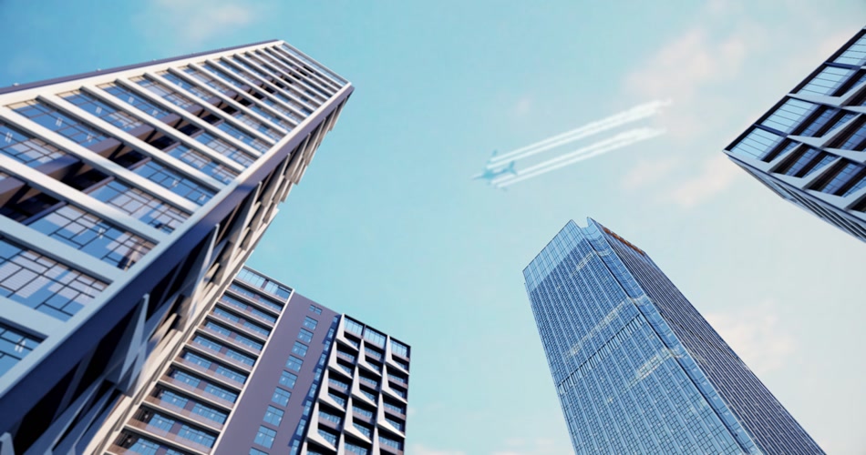 大气飞机飞掠商务区写字楼顶三维动画视频素材